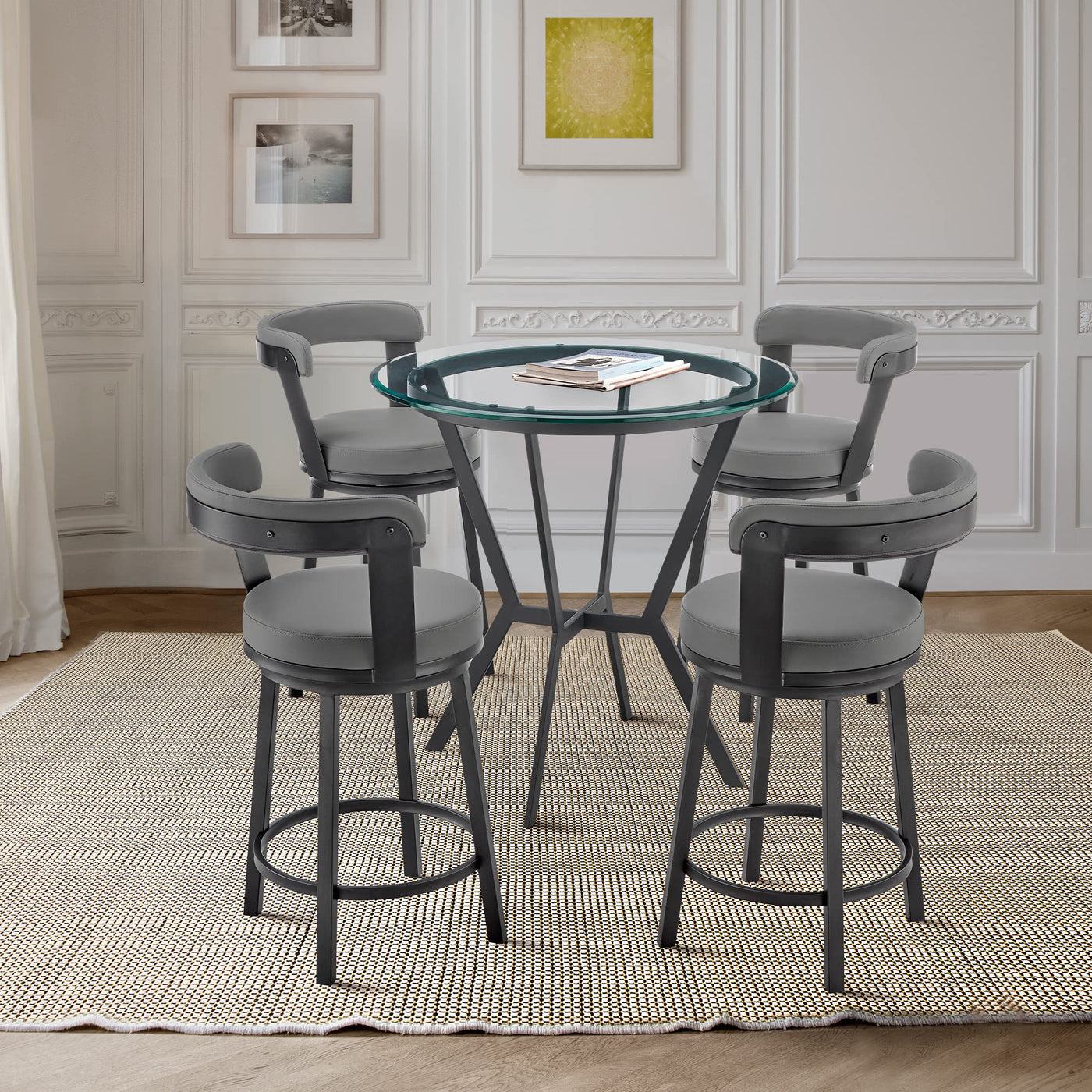 Take Dining Or Entertaining To The Next Level With The Naomi And Bryant Counter Height Dining Set From Armen Living The Naomi Is A Contemporary Bar Table That Adds A Touch Of Pure Sophistication To A Kitchen, Bar, Or Lounge Area, Or Even A Breakfast Nook It Features A Strong And Striking Black Metal X-Shaped Base, Giving It A Sleek And Stunning Visual The Bryant Metal Bar Stools Were Crafted With A Durable Frame Easy To Take Care Of And Clean, This Stool Will Give You Excellent Use For Years To Come The Faux Leather Upholstery Is Luxuriously Wrapped Around The High-Density Foam Cushions Of This Barstool, Adding Yet Another Comfortable Feature The Bryant Also Features A Convenient Metal Footrest, As Well As A 360-Degree Swivel Mechanism That Maximizes Mobility For You And Your Guests This 5-Piece Set Includes 4 Stools And 1 Round Table The Naomi And Bryant Dining Set Has A Black Metal Finish, Glass Tabletop, And Grey Faux Leather Upholstery The Bryant Stools Have A 26-Inch Seat Height And Can Support Up To 250Lbs Per Seat