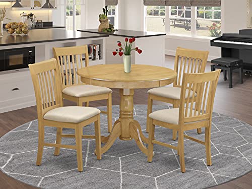 East West Furniture Anno5-Oak-C 5 Pieces Set 4 Room Chairs With Linen Fabric Seat And Slatted Back-Round Top And Pedestal Le